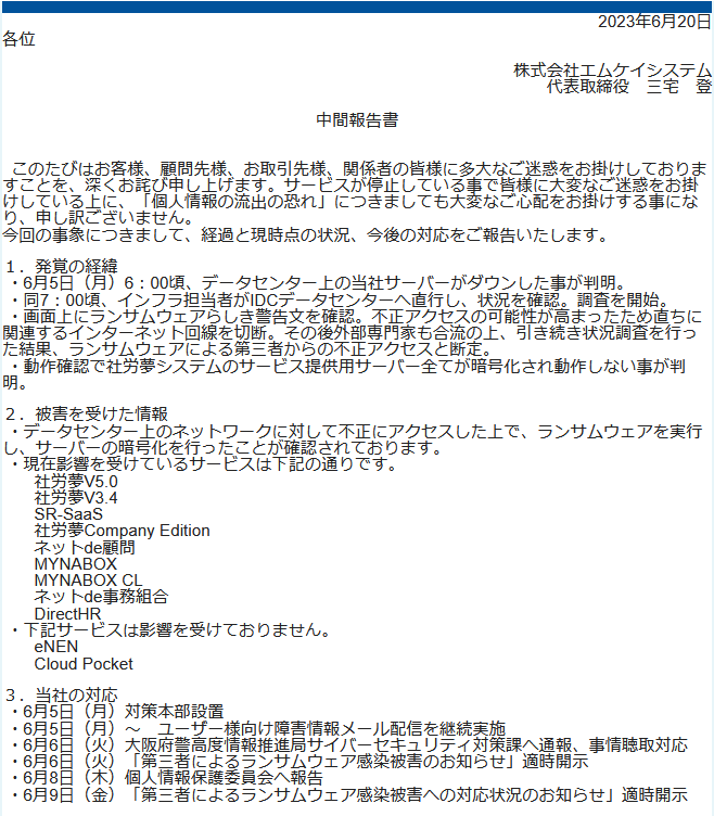 現時点での状況につき、社労夢の開発、運用会社の(株)エムケイシステムより以下の発表がありましたので、ありのままご報告いたします。