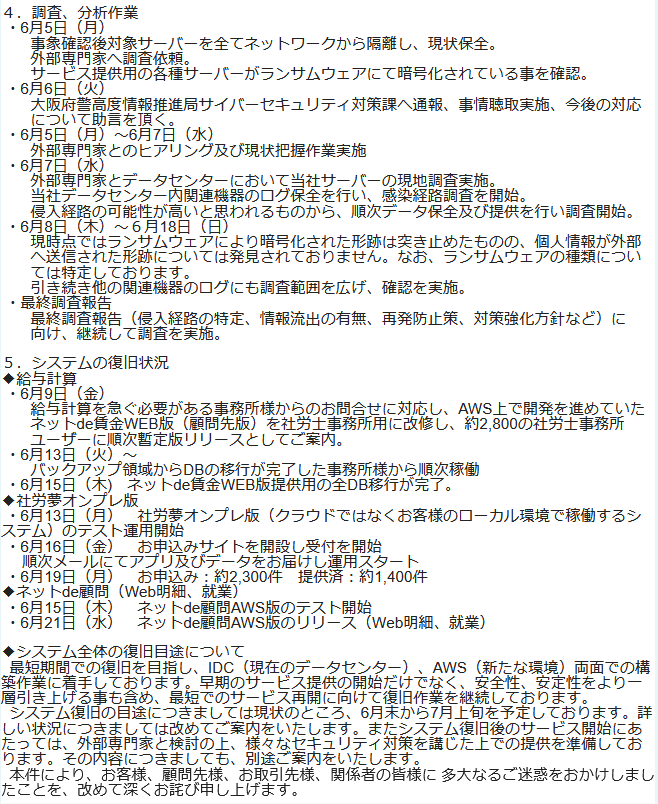 第1報・第2報・第3報で報告しました通り、現在佐倉商工会議所 労働保険事務組合で利用している(株)エムケイシステム製クラウドシステム(社労夢)がランサムウェア感染しシステム障害が発生しており7月末の完全復旧を目指して準備を進めています。
