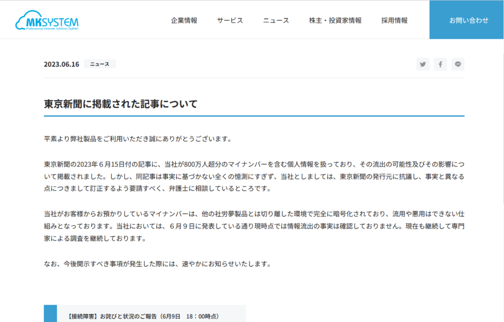 マイナンバーに関しましては、東京新聞の報道をきっかけに6月16日になって、エムケイシステムのほうから「漏洩無し」の広報が出ました。